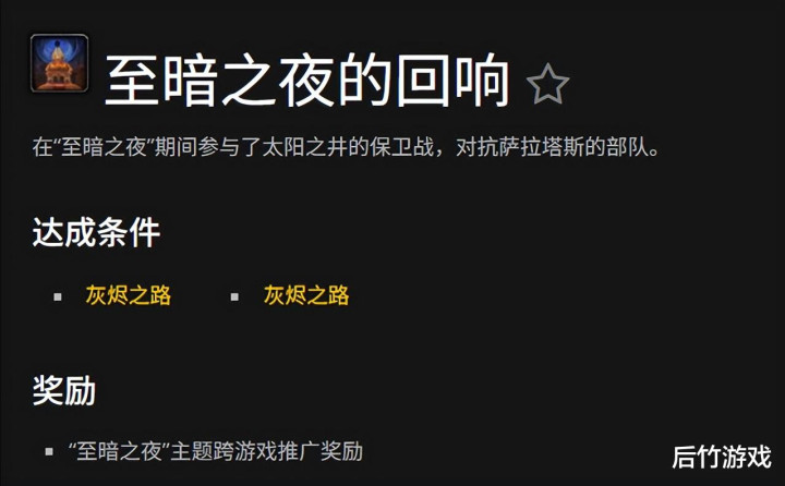 完成《至暗之夜》前导事件,在血精灵的家园回击虚无势力的入侵,在行径前收场“至暗之夜的回响”设立,即可得到虚无之羽龙鹰遨游坐骑,与你所有这个词在《甩掉的远征》经典周年挂牵版中伸开冒险。