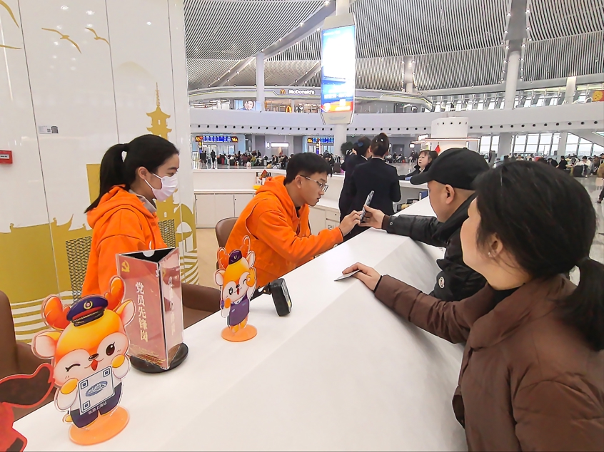 2月15日,时值小除夕,赶到火车站的游客连二赶三,简直都奔着除夕这顿团圆饭。他们惊喜地发现,除了春运保险使命主说念主员,还有身着橙色马甲的各大高校大学生志愿者看守各个点位,平和着一条条返乡之路。