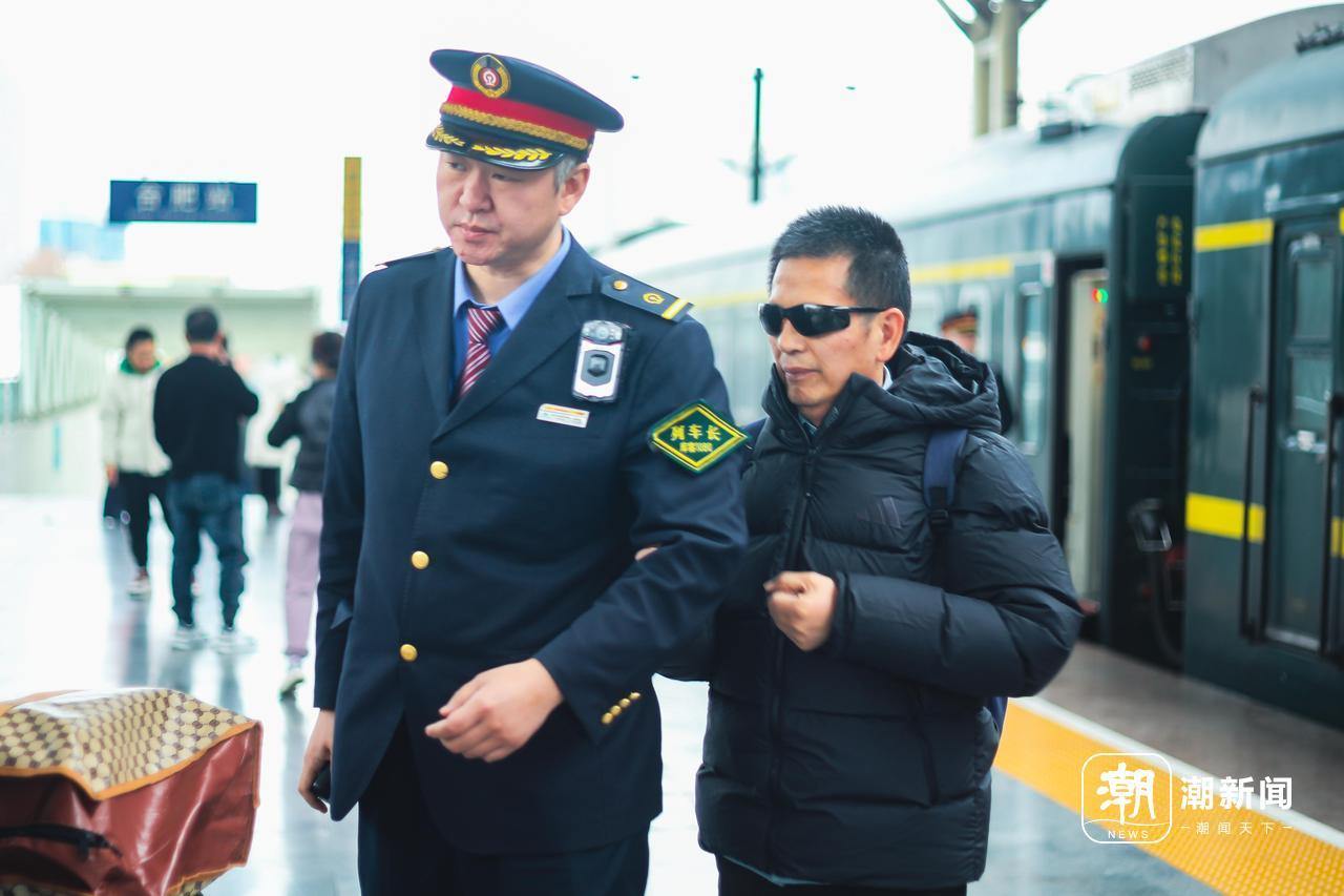 列车长李铭扶着盲东谈主下车。谢春晖/摄