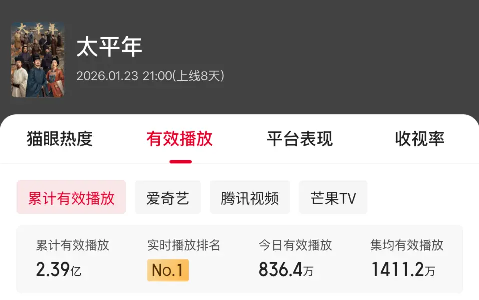 近期,电视剧《太平年》正在热播。诚然热度及话题度不足预期,但也劝诱了不少不雅众的眼神。端正发稿时,该剧累计灵验播放还是卓越两亿,达到了2.39亿,可见该剧照旧有不少不雅众可爱。